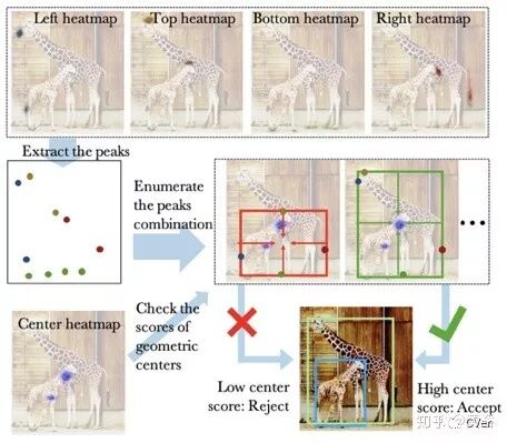 Similar as CornerNet, it formulates the problem of finding bounding box as finding some corner points. But instead of two corners as in CornerNet, it requires four corner points and one center point, which is computed via peaks of heatmaps of each corner points.