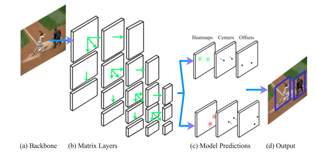 To detect objects, it utilizes the similar idea of center net: the location of top left corner and bottom right corner are detected, the centerness is also computed. Then the result for feature x_{i+k, i+[0:k]} and x_{i+[0:k], i+k} is aggreated via nonmax suppression.