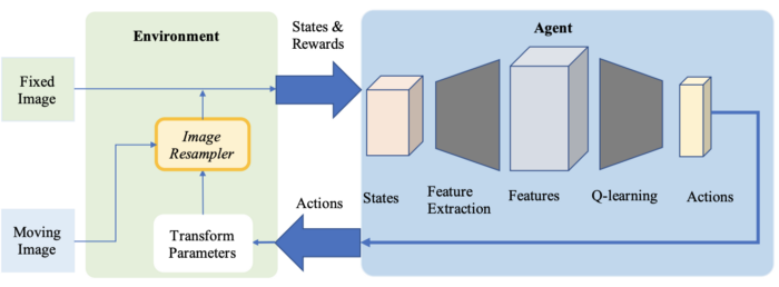 An Artificial Agent for Robust Image Registration proposed a reinforcement learning based approach for learning the transform between two images, where the state is the two images and the action is the transform. Similar idea was also studied in [Robust non-rigid registration through agent-based action learning](https://hal.inria.fr/hal-01569447/document)