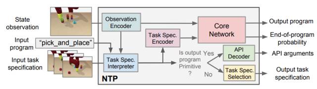 Fig. 2: Neural Task Programming (NTP): Given an input program, a task specification, and the current environment observation, a NTP model predicts the sub-level program to run, the subsequence of the task specification that the sub-level program should take as input, and if the current program should stop.