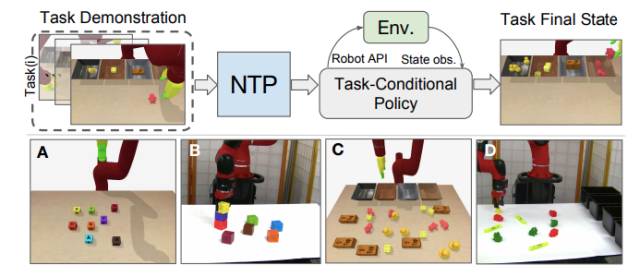 Fig. 1: (top) At test time, NTP instantiates a task-conditional policy (a neural program) that performs the specified task by interpreting a demonstration of a task. The policy interacts with the environment through robot APIs. (bottom) We evaluate NTP on Block Stacking (A,B), Object Sorting (C, D) and Table Clean-up (Figure 8) tasks in both simulated and real environment.