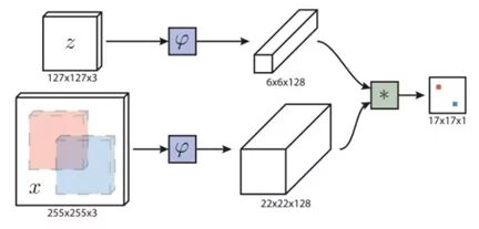 SiameseFC has been proposed for visual object tracking, where z is the template, x is the input frame, the object is matched by finding the maximum in the cross-correlation of the feature of z on the feature of x. To handle variation change, pyramid is constructed from the input frame. In SiameseFC, the templated is not updated, which has been revised in following work.