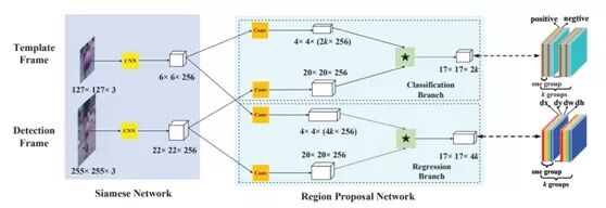 SiamRPN improves SiameseFC by introducing region proposal network (RPN) to handle scale changes during the visual object tracking. The response of template and input are sent to the classification branch and regression branch of RPN. In each of the branch, k anchors generated and the cross-correlation are applied between the template and input based on each of the anchor.